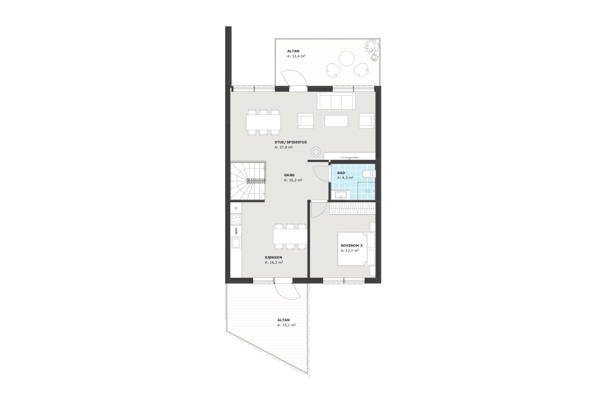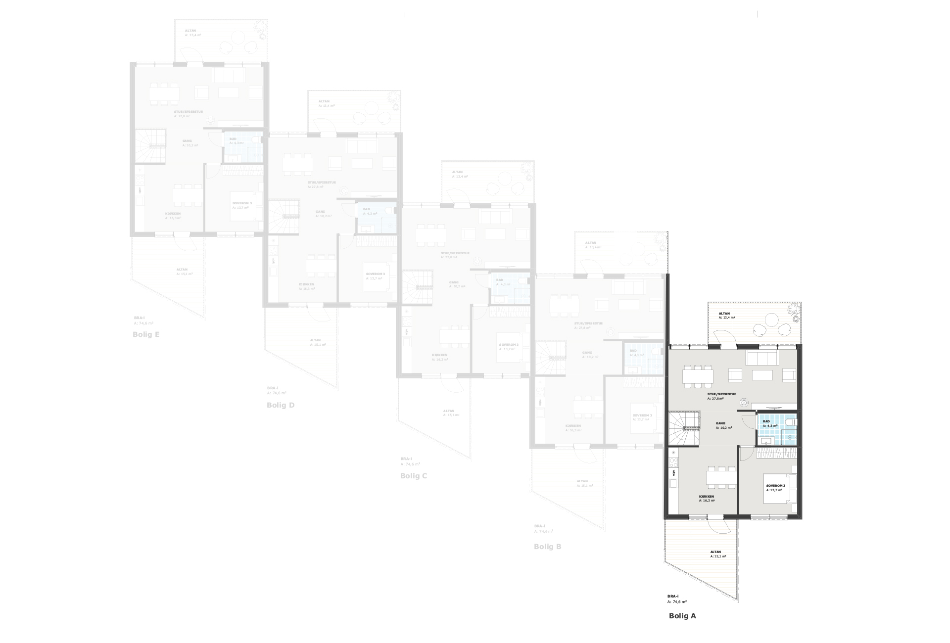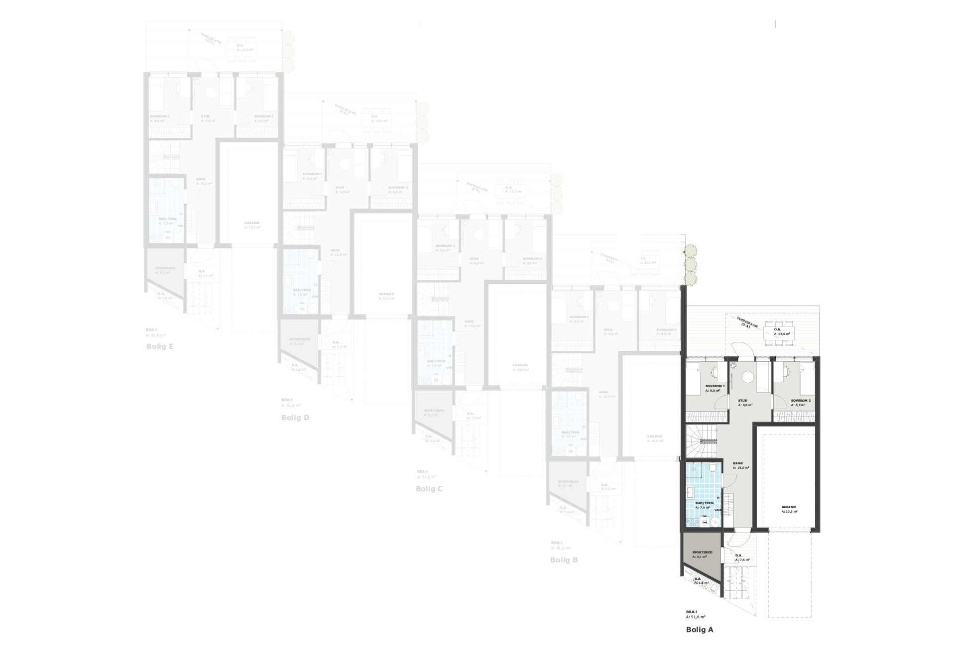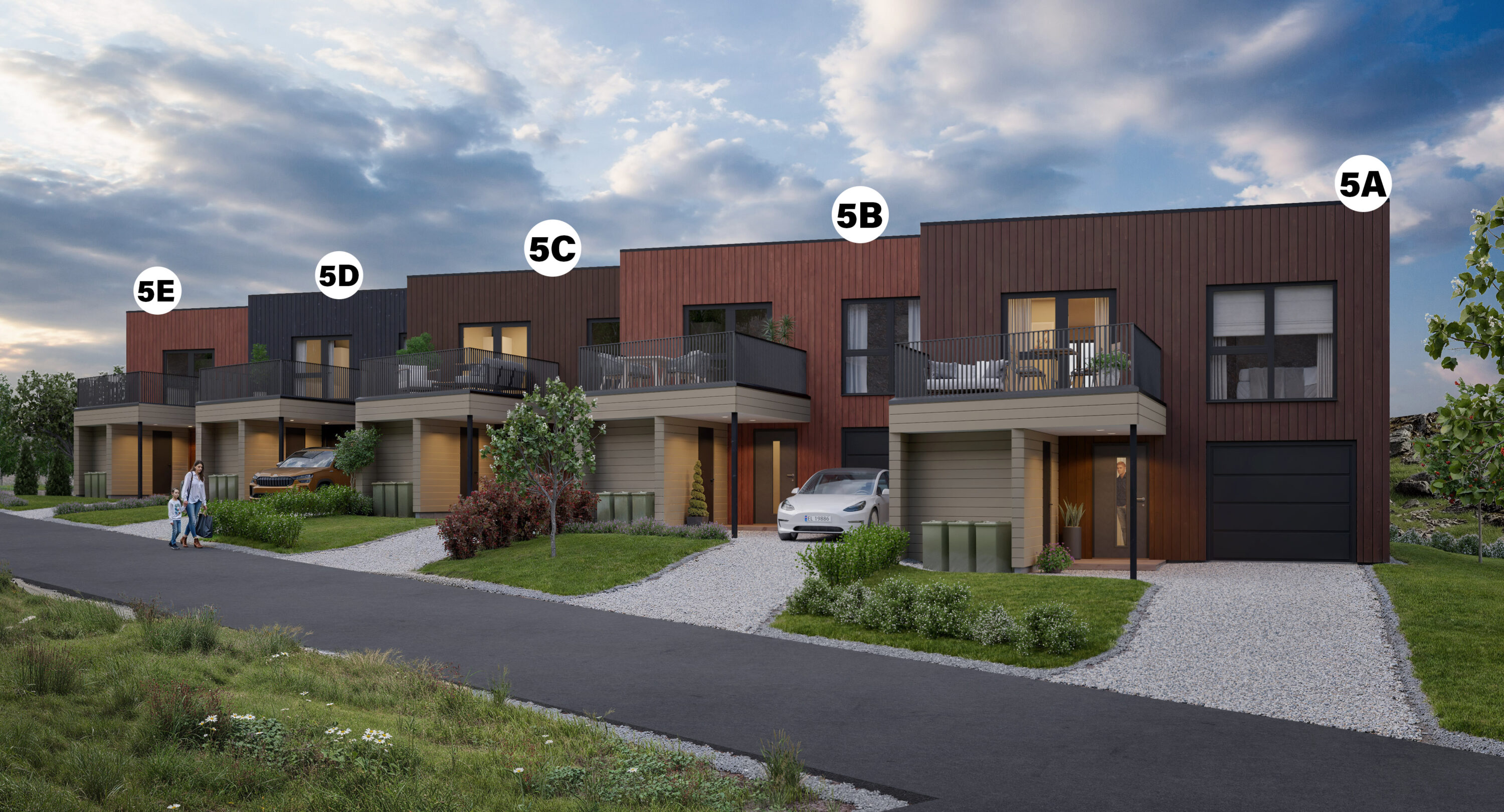 I dette prosjektet er det prosjektert fem moderne rekkehus utformet for å møte behovene til familier som ønsker både komfort og smarte planløsninger, blant annet har vi lagt opp til at det er plass til mye garderobe på alle soverom. Vi har gjort plass til en egen stue ved 2 av soverommene og det er rikelig med oppbevaringsplass i sportsbod og garasje.