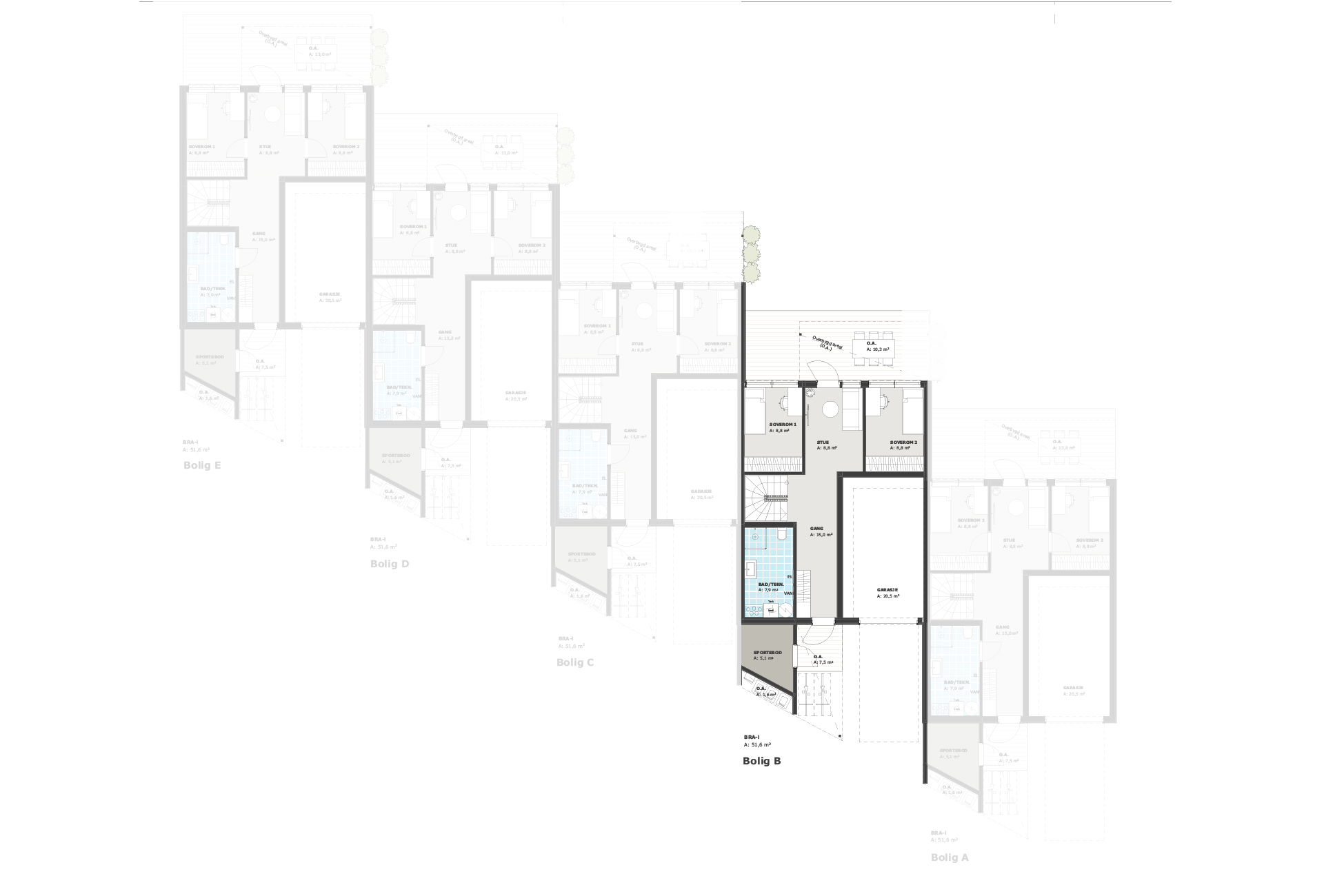 I dette prosjektet er det prosjektert fem moderne rekkehus utformet for å møte behovene til familier som ønsker både komfort og smarte planløsninger, blant annet har vi lagt opp til at det er plass til mye garderobe på alle soverom. Vi har gjort plass til en egen stue ved 2 av soverommene og det er rikelig med oppbevaringsplass i sportsbod og garasje.