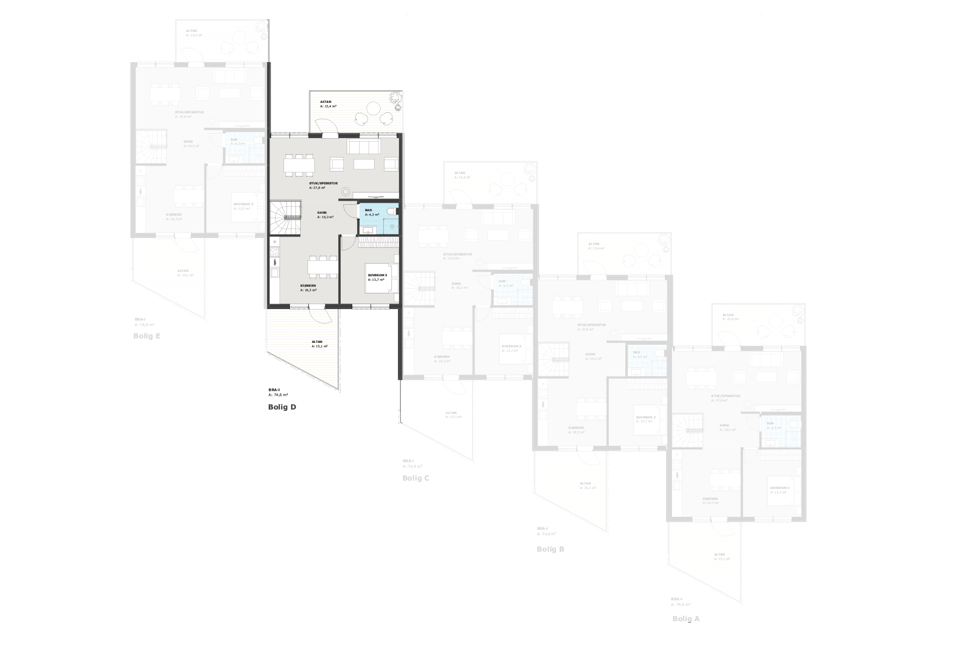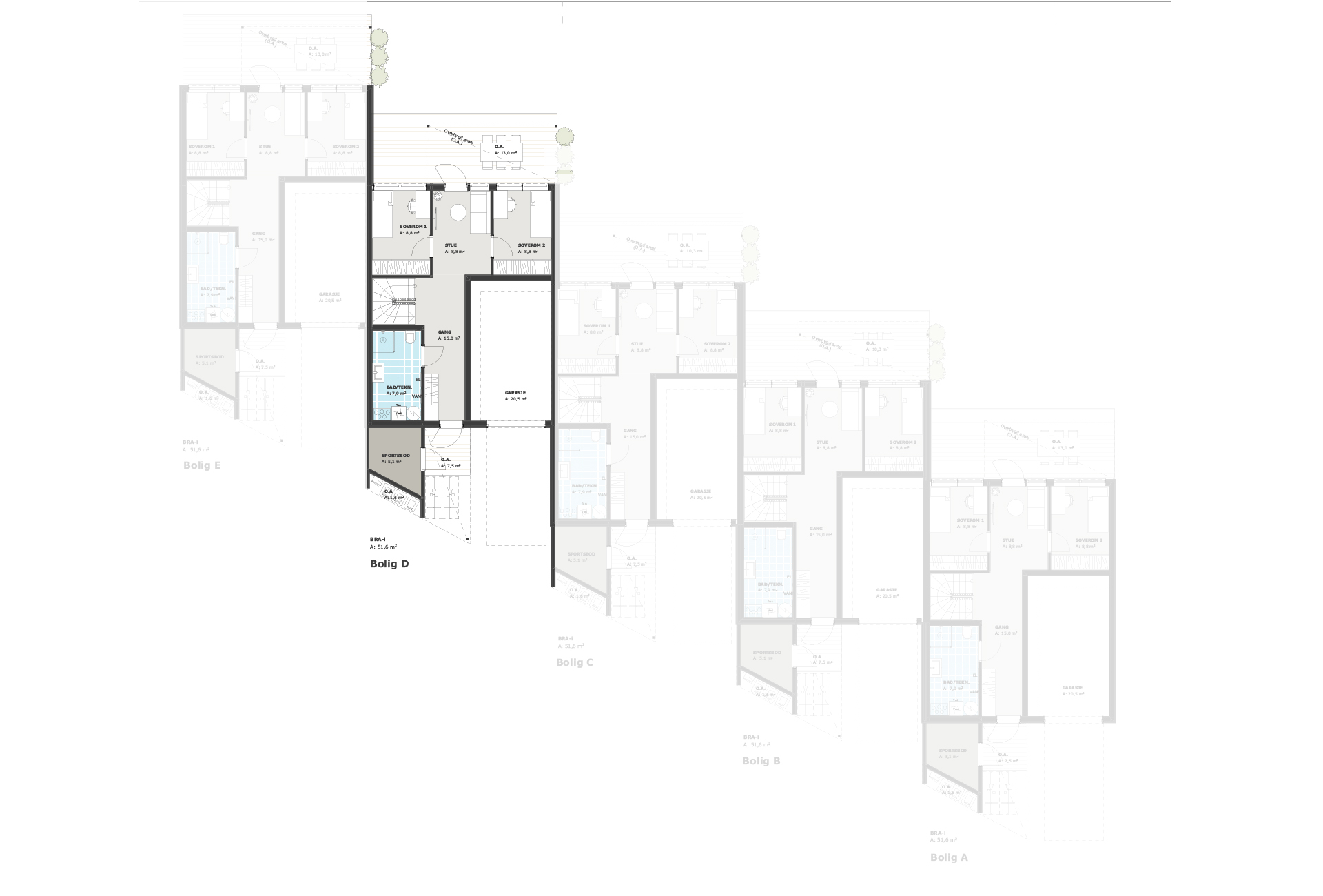 I dette prosjektet er det prosjektert fem moderne rekkehus utformet for å møte behovene til familier som ønsker både komfort og smarte planløsninger, blant annet har vi lagt opp til at det er plass til mye garderobe på alle soverom. Vi har gjort plass til en egen stue ved 2 av soverommene og det er rikelig med oppbevaringsplass i sportsbod og garasje.